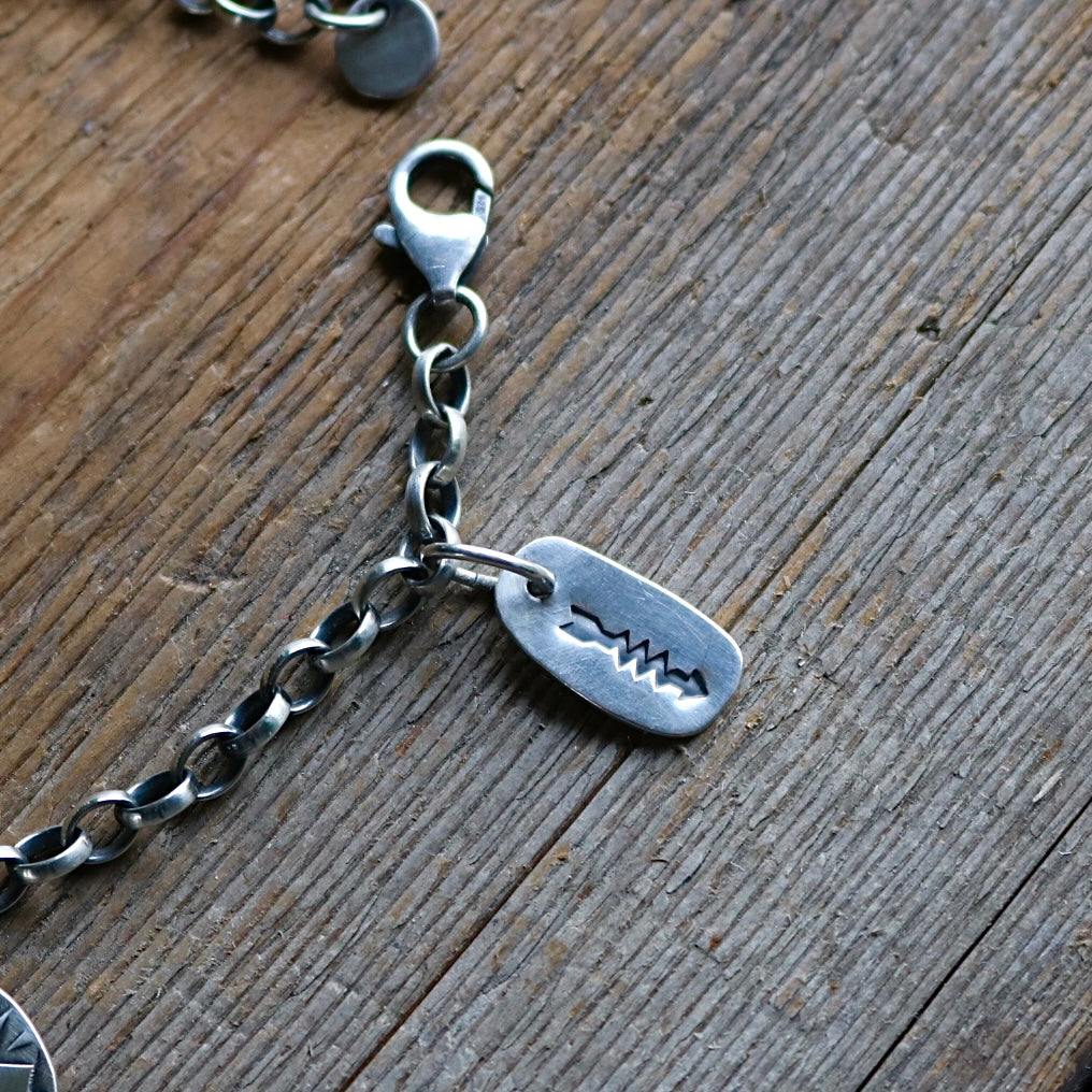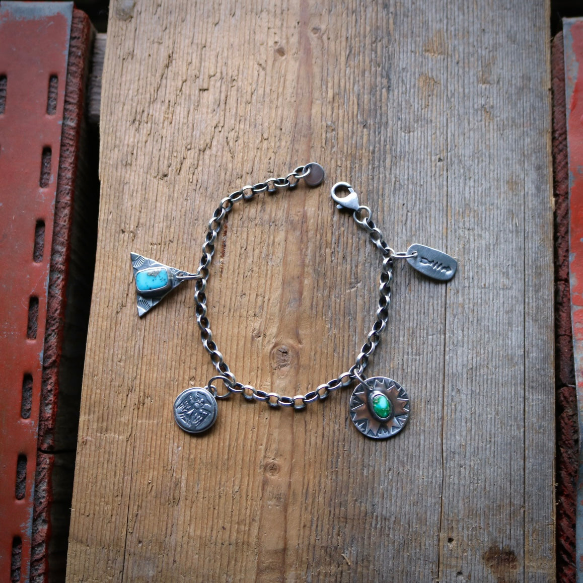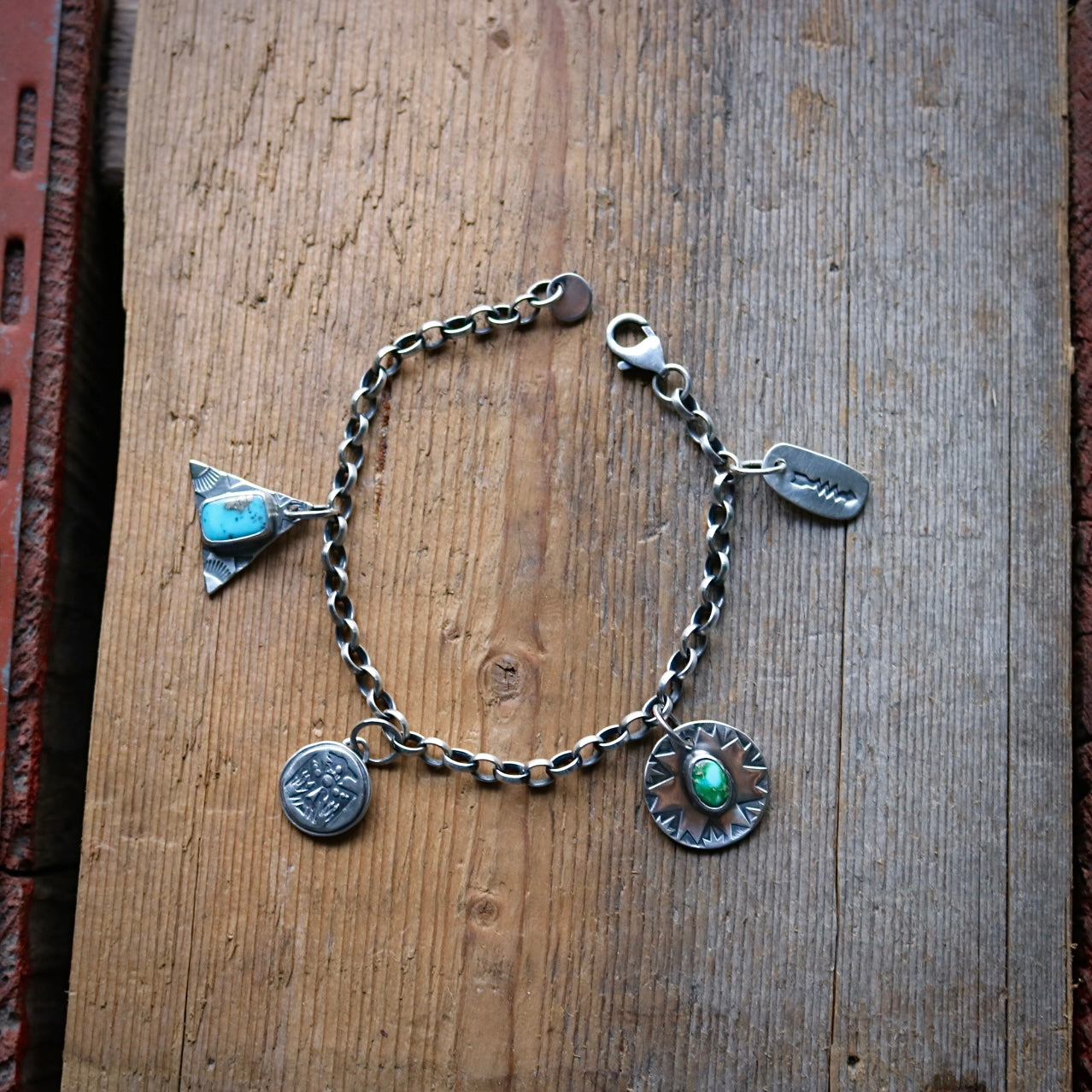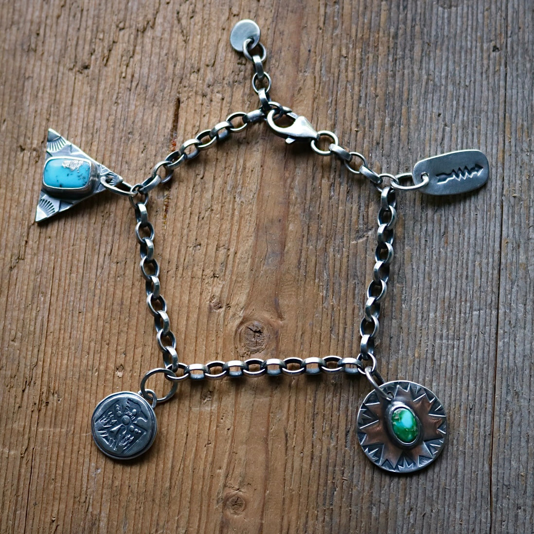 Handmade sterling silver charm bracelet including sterling triangle pendant with Nacozari turquoise, sterling stamped thunderbird pendant, sterling stamped round pendant with Sonoran Mountain turquoise and stamped arrow on a oxidised sterling silver belcher oval chain + lobster clasp.