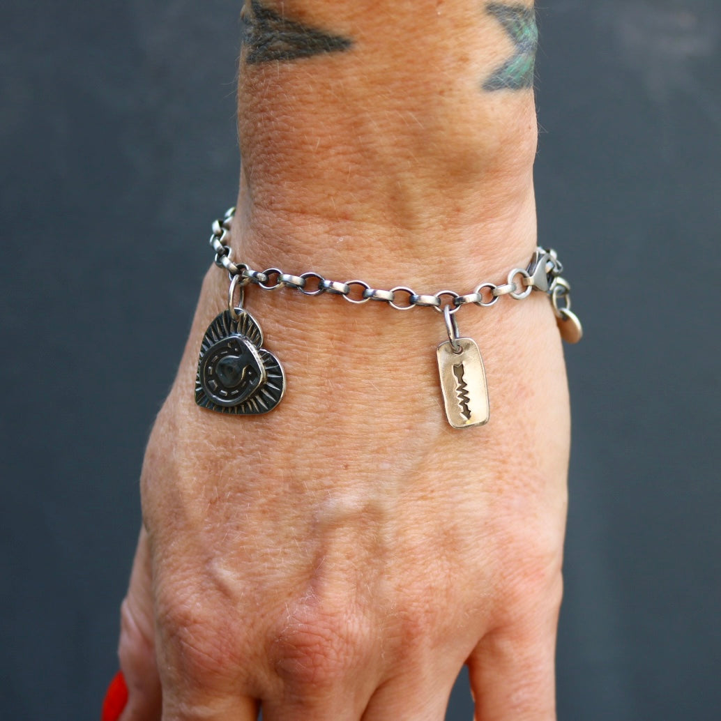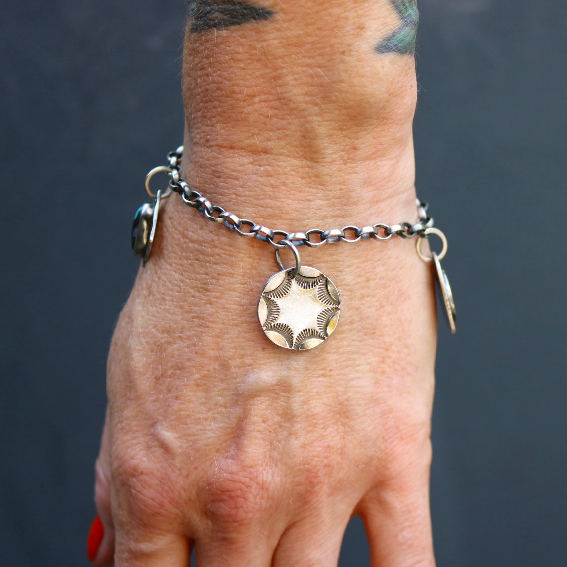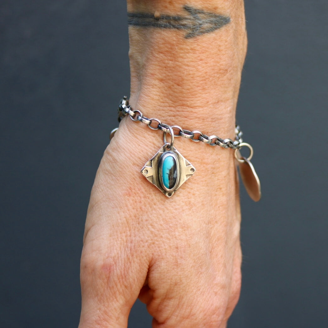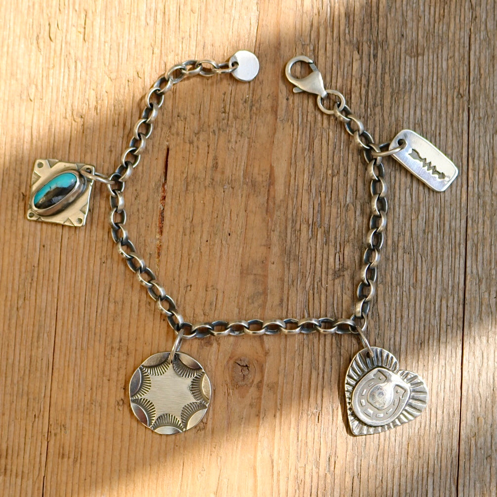 Handmade sterling silver charm bracelet including sterling pendant with blue moon turquoise, sterling stamped round pendant, sterling stamped heart pendant with stamped horseshoe and stamped arrow on a oxidised sterling silver belcher oval chain + lobster clasp.