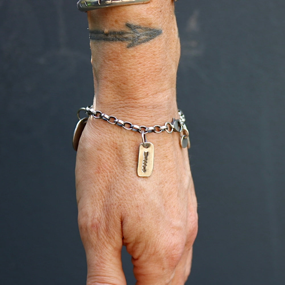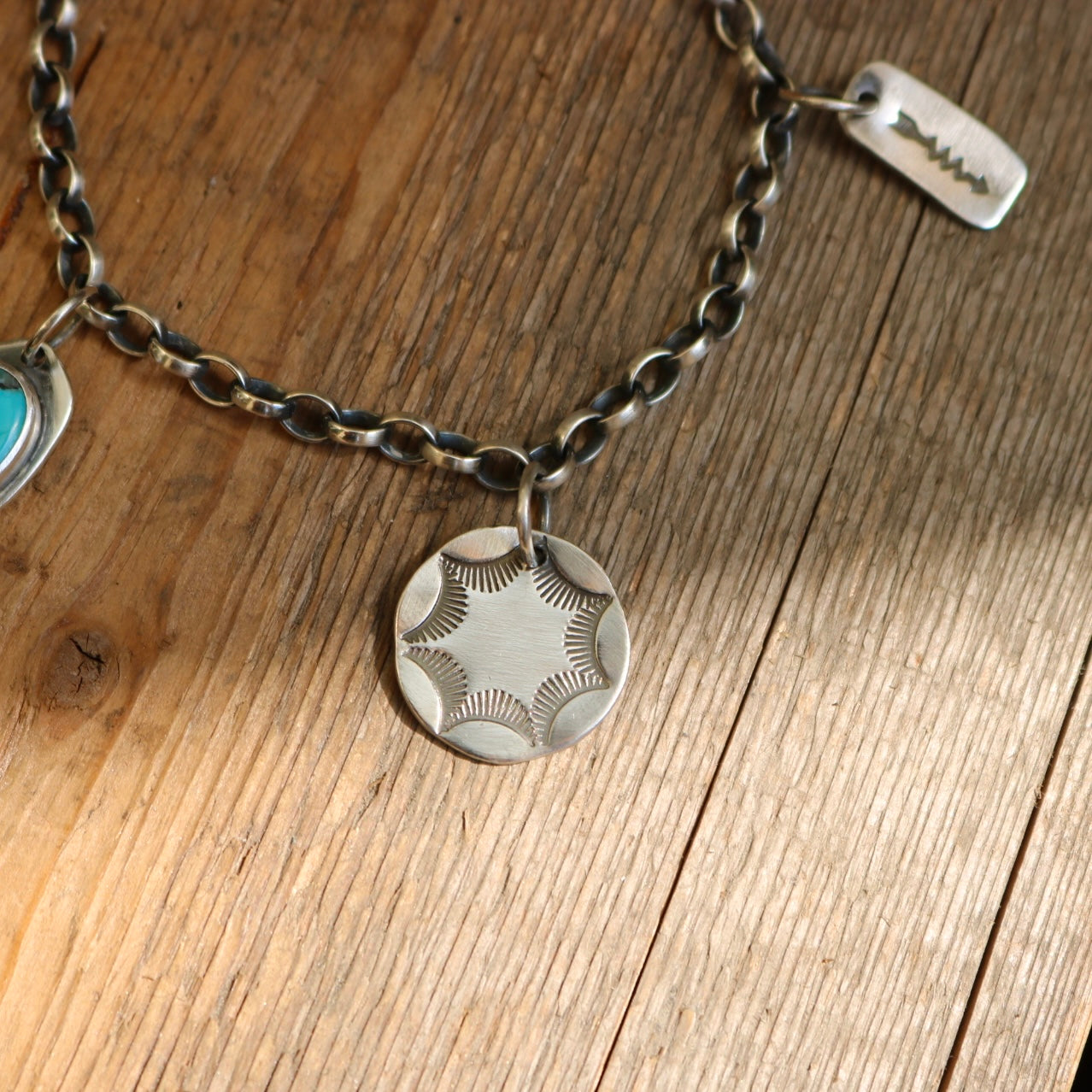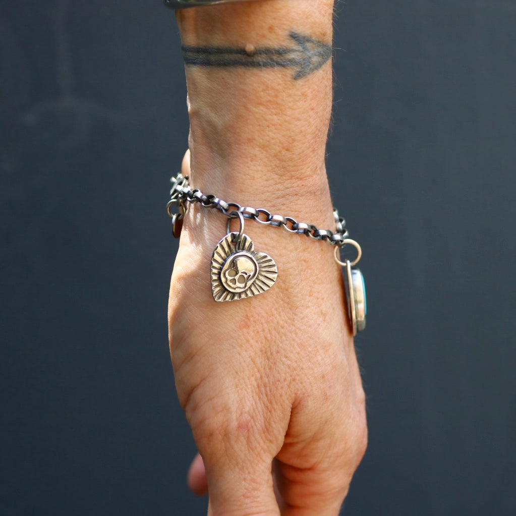 Handmade sterling silver charm bracelet including sterling pendant with blue moon turquoise, sterling stamped heart pendant with stamped skull, sterling stamped round pendant and stamped arrow on a oxidised sterling silver belcher oval chain + lobster clasp.