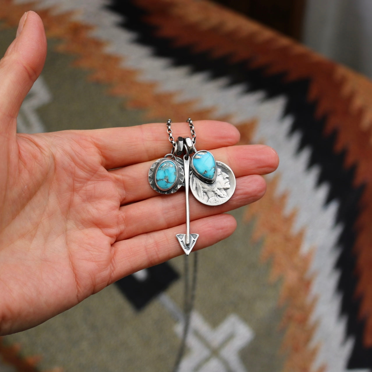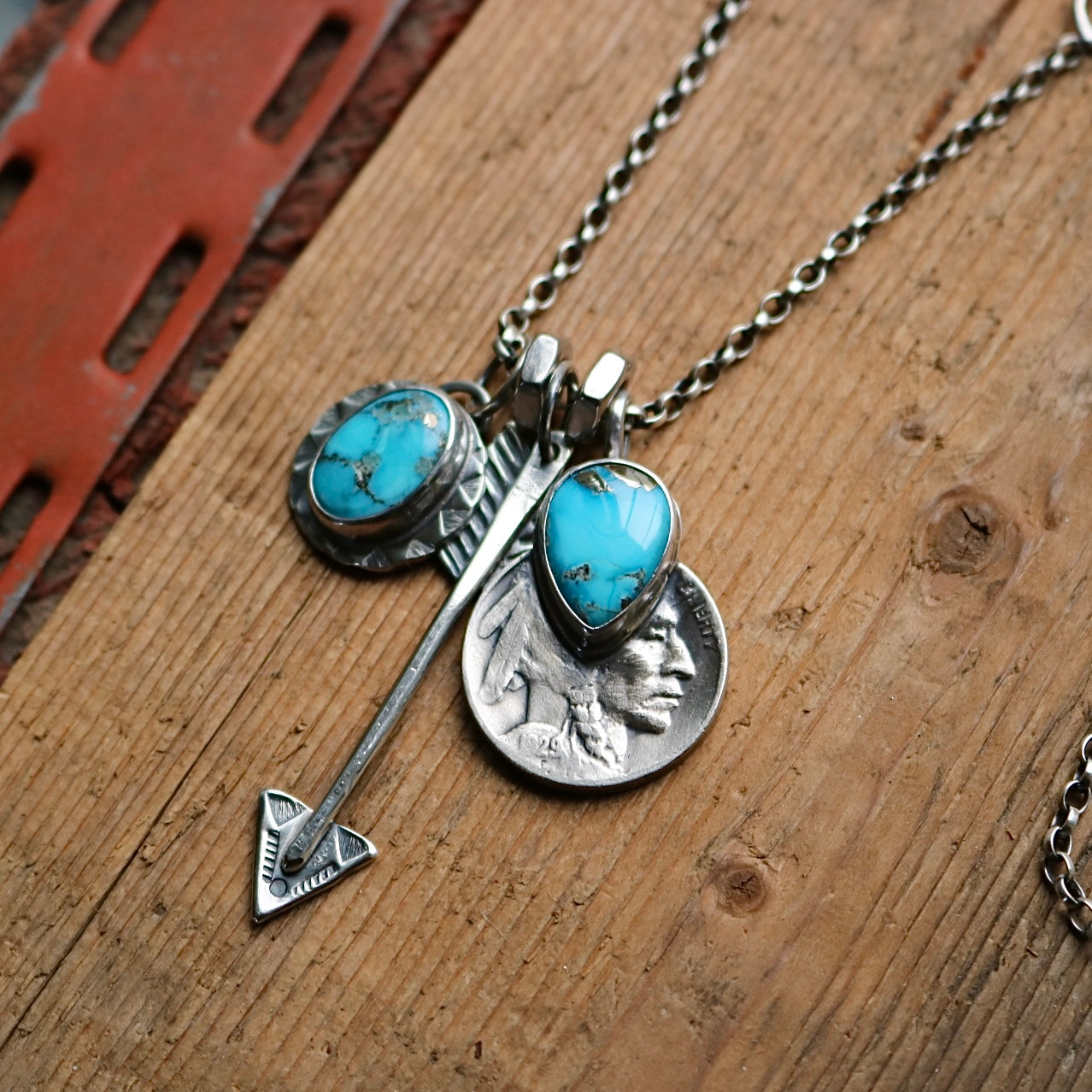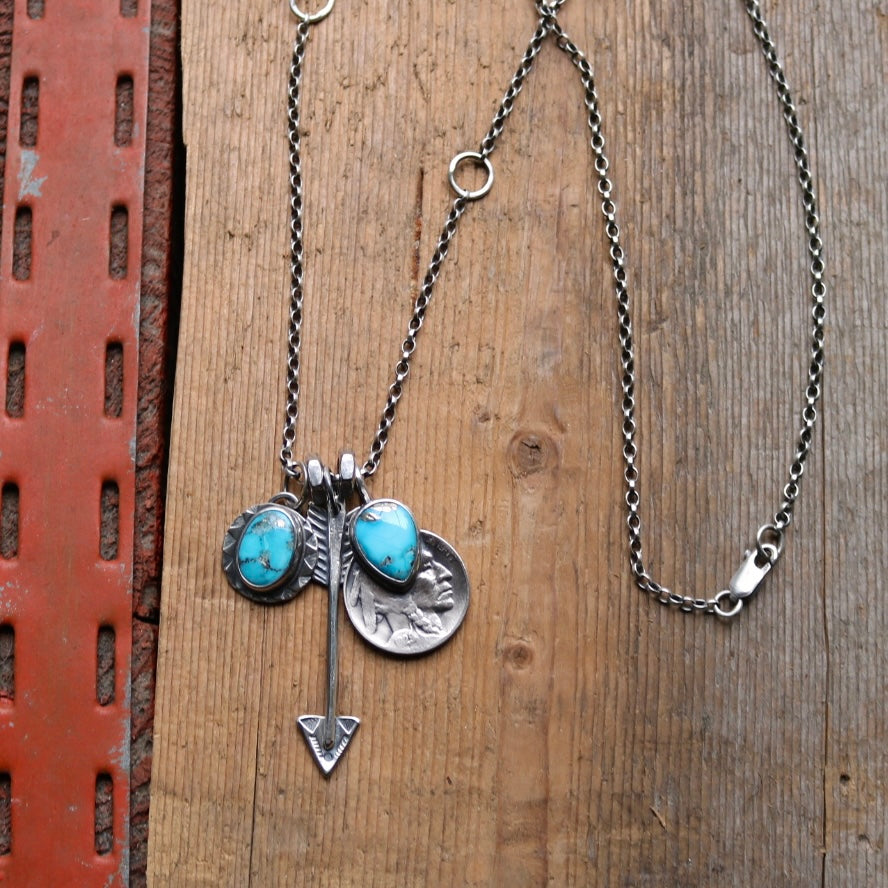 Hand made sterling silver round pendant with Blue Bird turquoise, sterling silver arrow pendant + a 1929 Indian head nickel with Blue Bird turquoise on a sterling silver oxidised belcher chain with sterling silver links and lobster clasp.