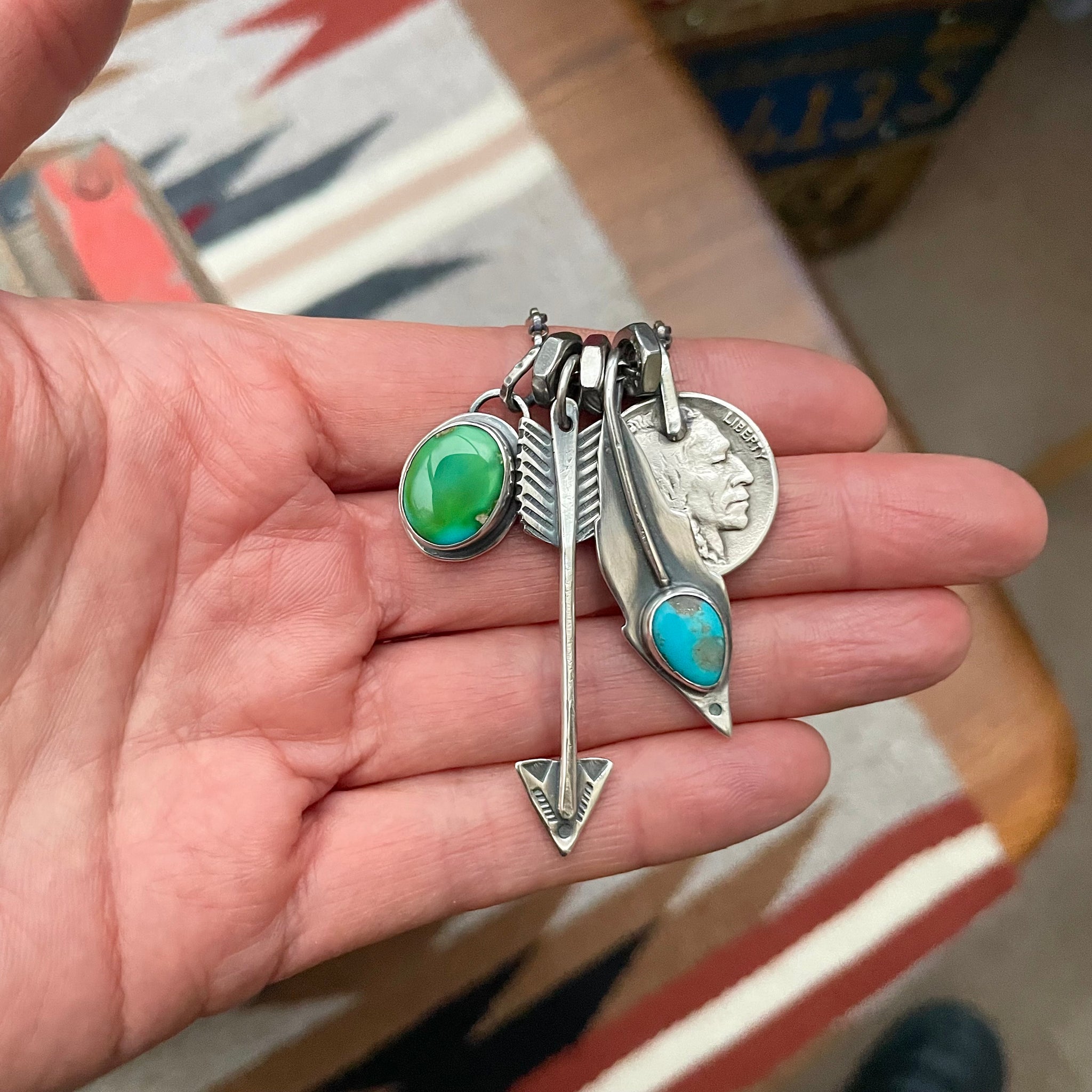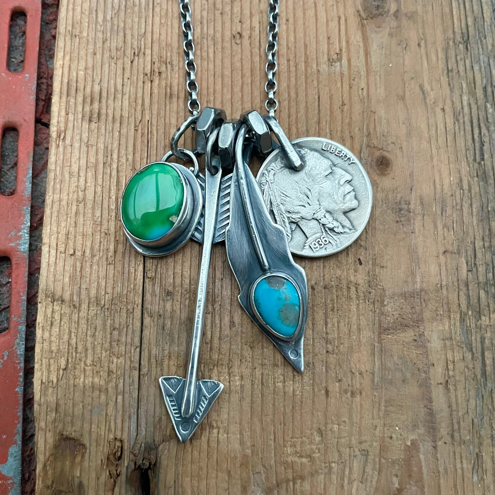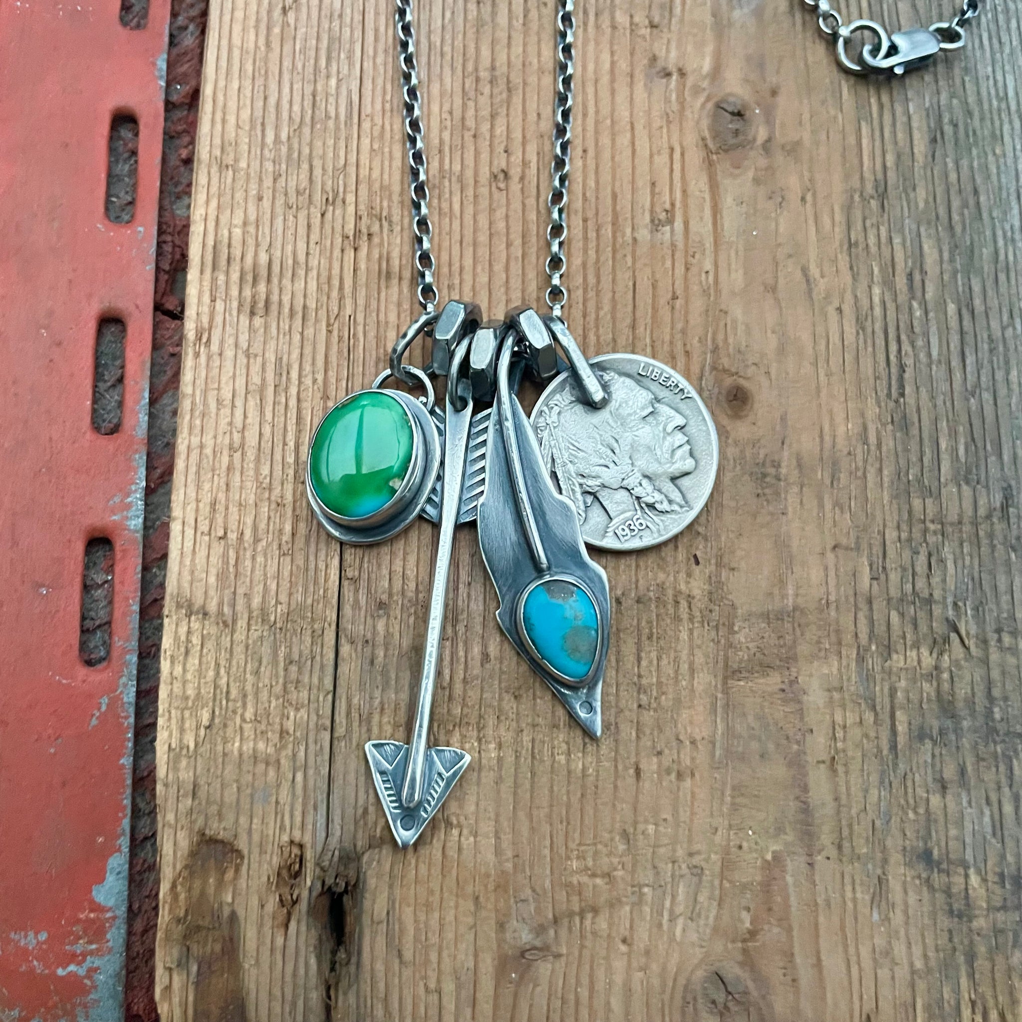 Sterling silver pendant with Sonoran Mountain, sterling silver feather with Blue Bird turquoise, sterling silver arrow pendant with a 1936 Indian head nickel on a sterling silver oxidised belcher chain with sterling silver links and lobster clasp.