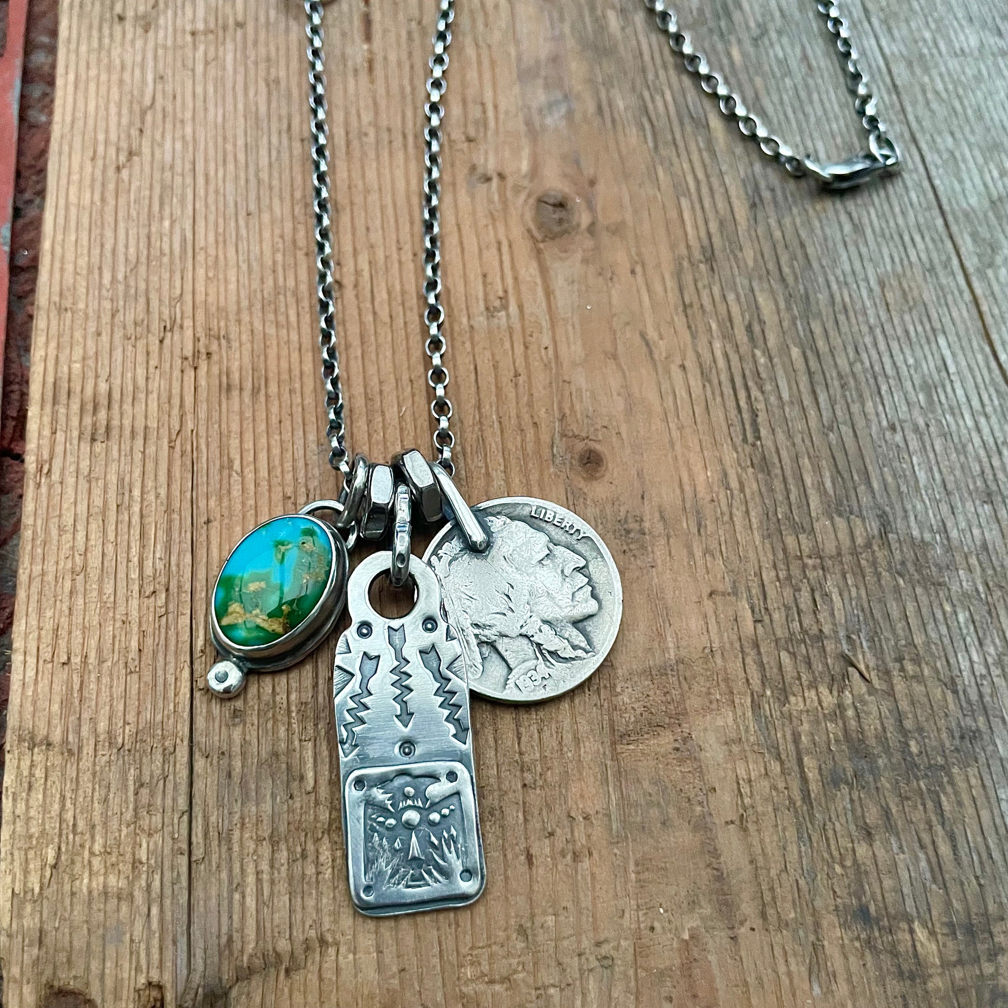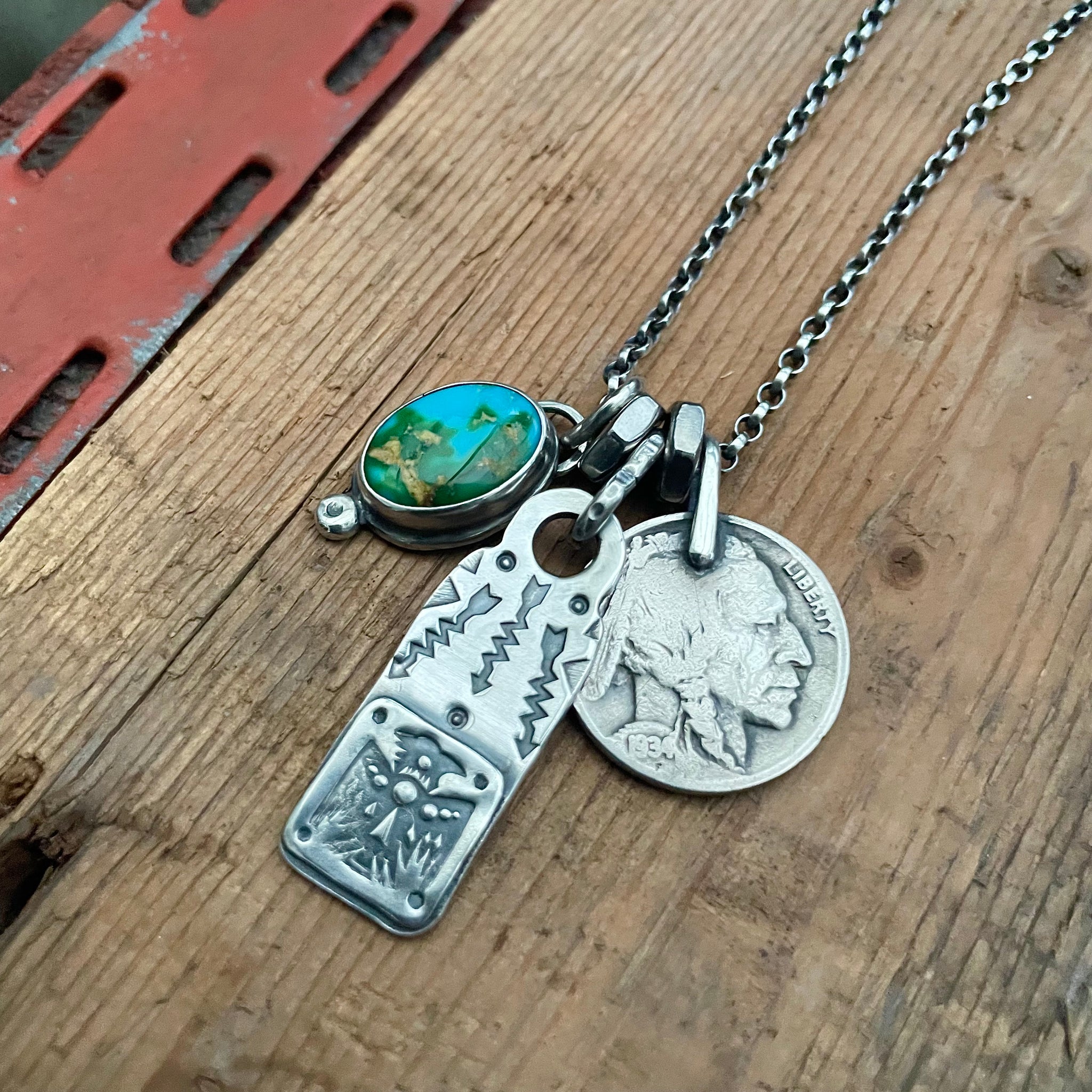 Handmade sterling silver pendant with Sonoran Mountain turquoise, handmade sterling bar pendant with stamped thunderbird + a 1934 Indian head nickel on a sterling silver oxidised belcher chain with sterling silver links and lobster clasp.