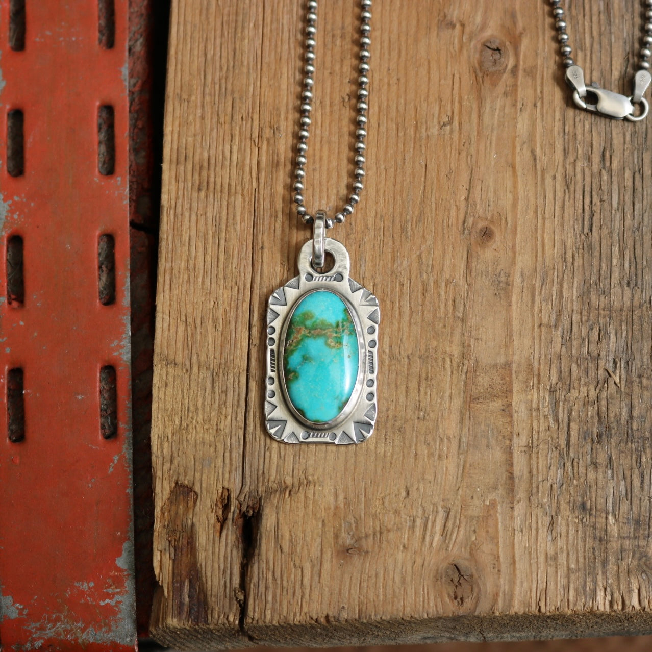 Handmade sterling silver dog tag with Sonoran Mountain turquoise (pendant measures 4cm x 2cm) with hand stamped details on a oxidised sterling silver ball chain with sterling silver lobster clasp.