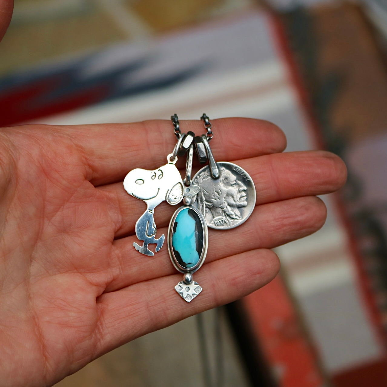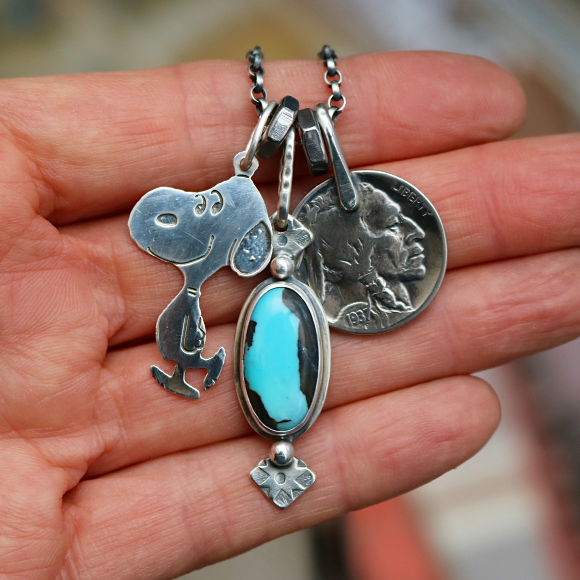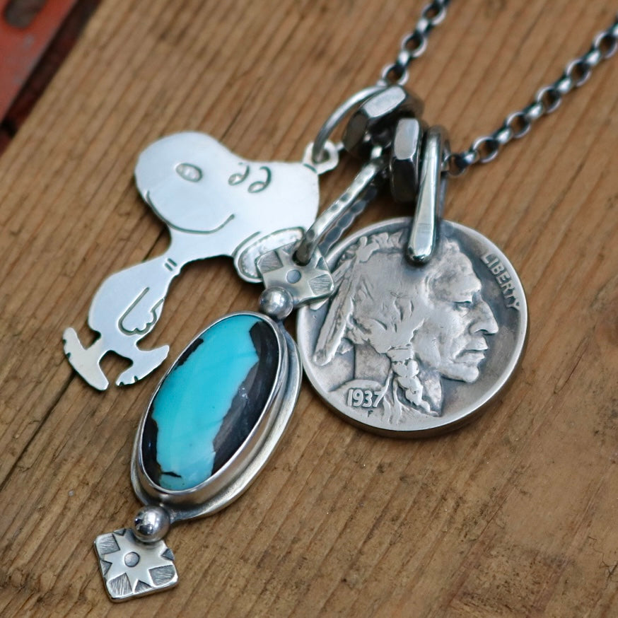 Vintage sterling silver Snoopy pendant (stamped sterling silver on back), blue moon turquoise + sterling silver pendant with a 1937 Indian head nickel on a sterling silver oxidised belcher chain with sterling silver links and lobster clasp.